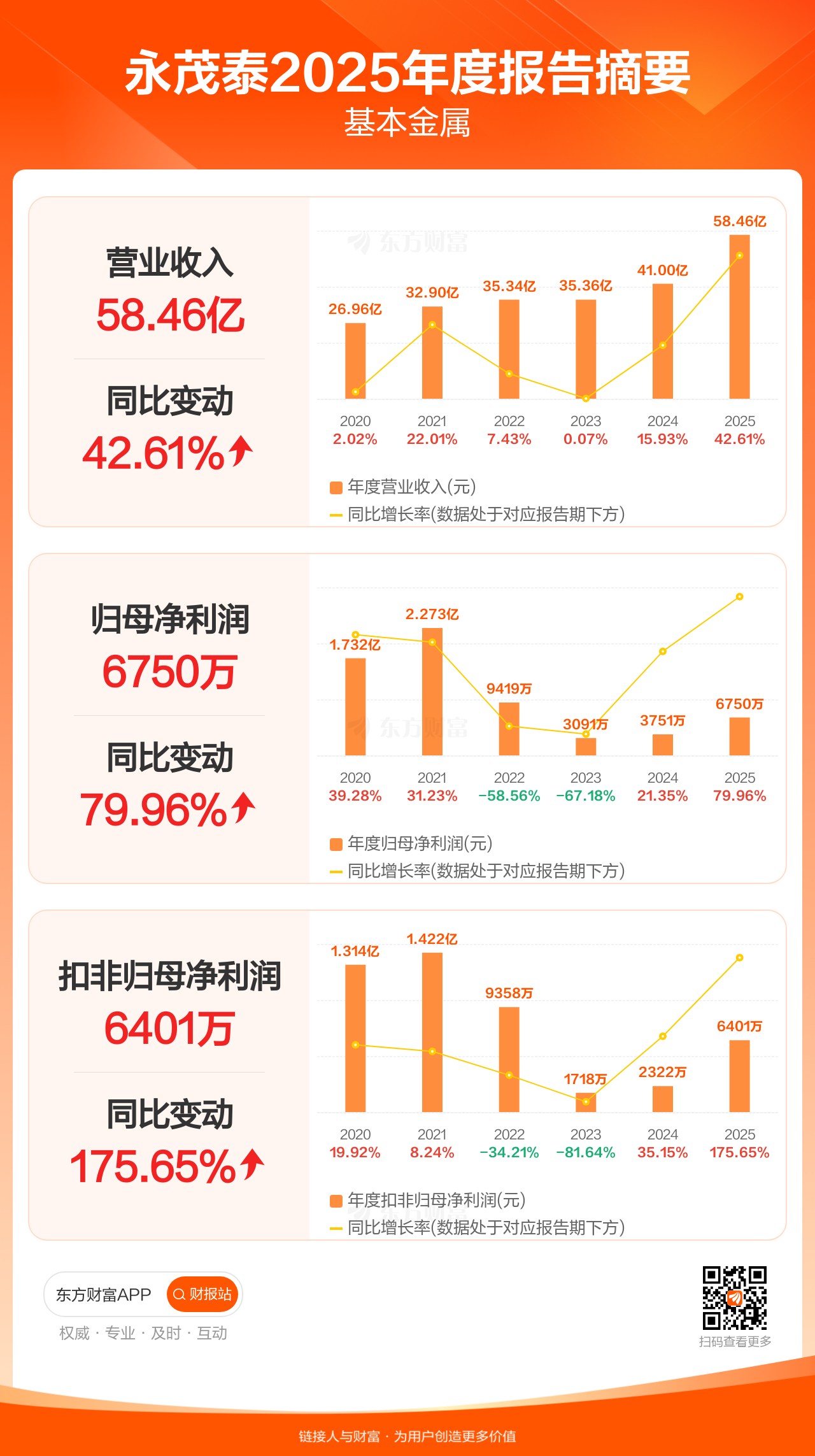 永茂泰4月11日发布2025年年报显示,公司全年实现营业收入58.46亿元,同比增长42.61%;归母净利润6750.36万元,同比增长79.96%;扣非归母净利润6401.36万元,同比增长175.65%。
