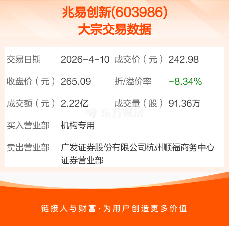 2026年4月10日,兆易创新发生1笔大宗交易,共成交91.36万股,成交金额2.22亿元,占其流通市值比例为0.13%。