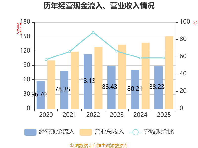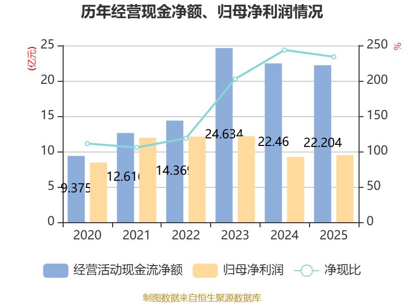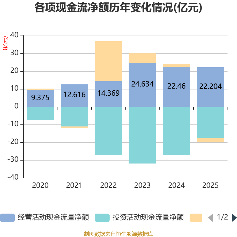 截至2025年,公司经营活动现金流净额为22.2亿元,同比下降1.14%;筹资活动现金流净额-2.15亿元,同比减少3.86亿元;投资活动现金流净额-17.64亿元,上年同期为-27.3亿元。