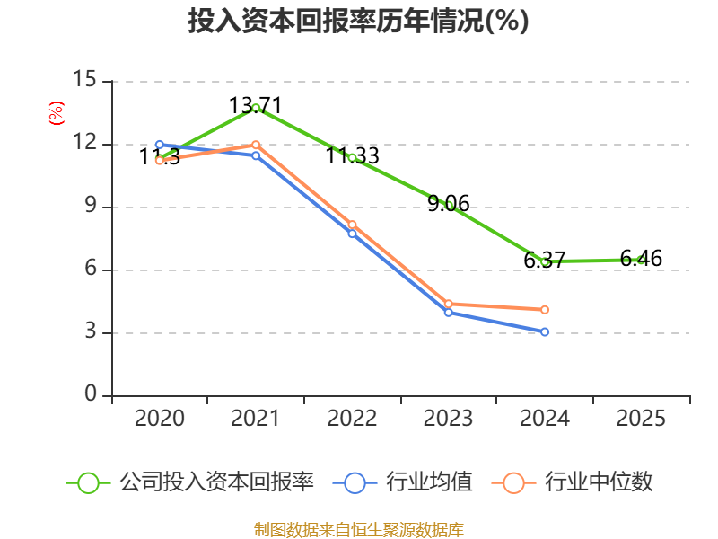 数据显示,2025年公司加权平均净资产收益率为9.95%,较上年同期下降0.55个百分点。公司2025年投入资本回报率为6.46%,较上年同期上升0.09个百分点。