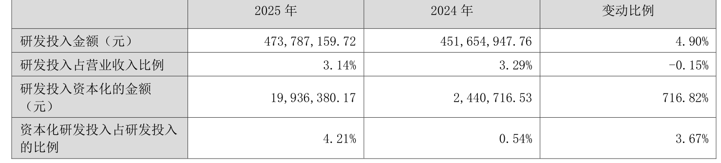2025年全年,公司研发投入金额为4.74亿元,同比增长4.9%;研发投入占营业收入比例为3.14%,相比上年同期下降0.15个百分点。此外,公司全年研发投入资本化率为4.21%。