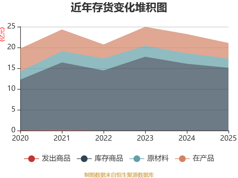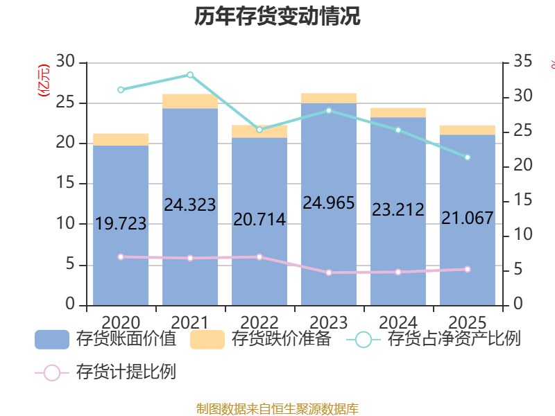 从存货变动来看,截至2025年末,公司存货账面价值为21.07亿元,占净资产的21.31%,较上年末减少2.14亿元。其中,存货跌价准备为1.15亿元,计提比例为5.16%。
