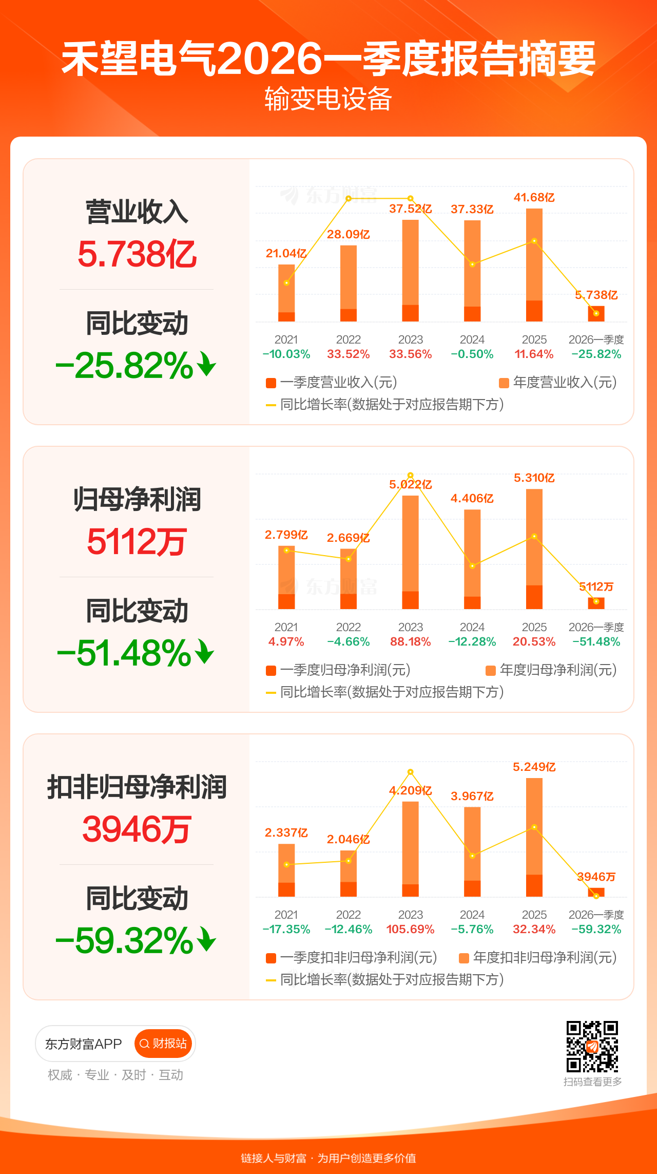 禾望电气4月11日发布2026年一季报显示,公司一季度实现营业收入5.74亿元,同比下滑25.82%;归母净利润5112.13万元,同比下滑51.48%;扣非归母净利润3946.25万元,同比下滑59.32%。