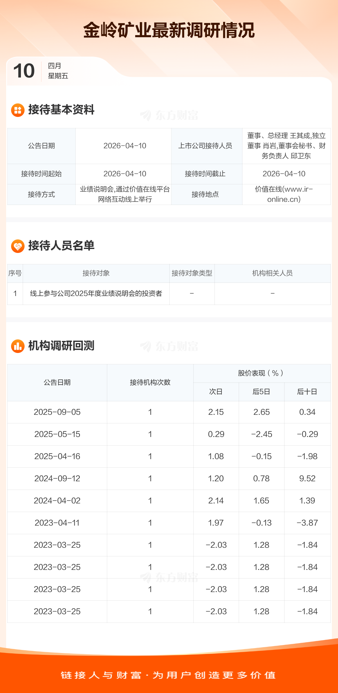 金岭矿业4月10日公告称,4月10日接待线上参与公司2025年度业绩说明会的投资者等1家机构调研。接待人员包括董事、总经理 王其成,独立董事 肖岩,董事会秘书、财务负责人 邱卫东。
