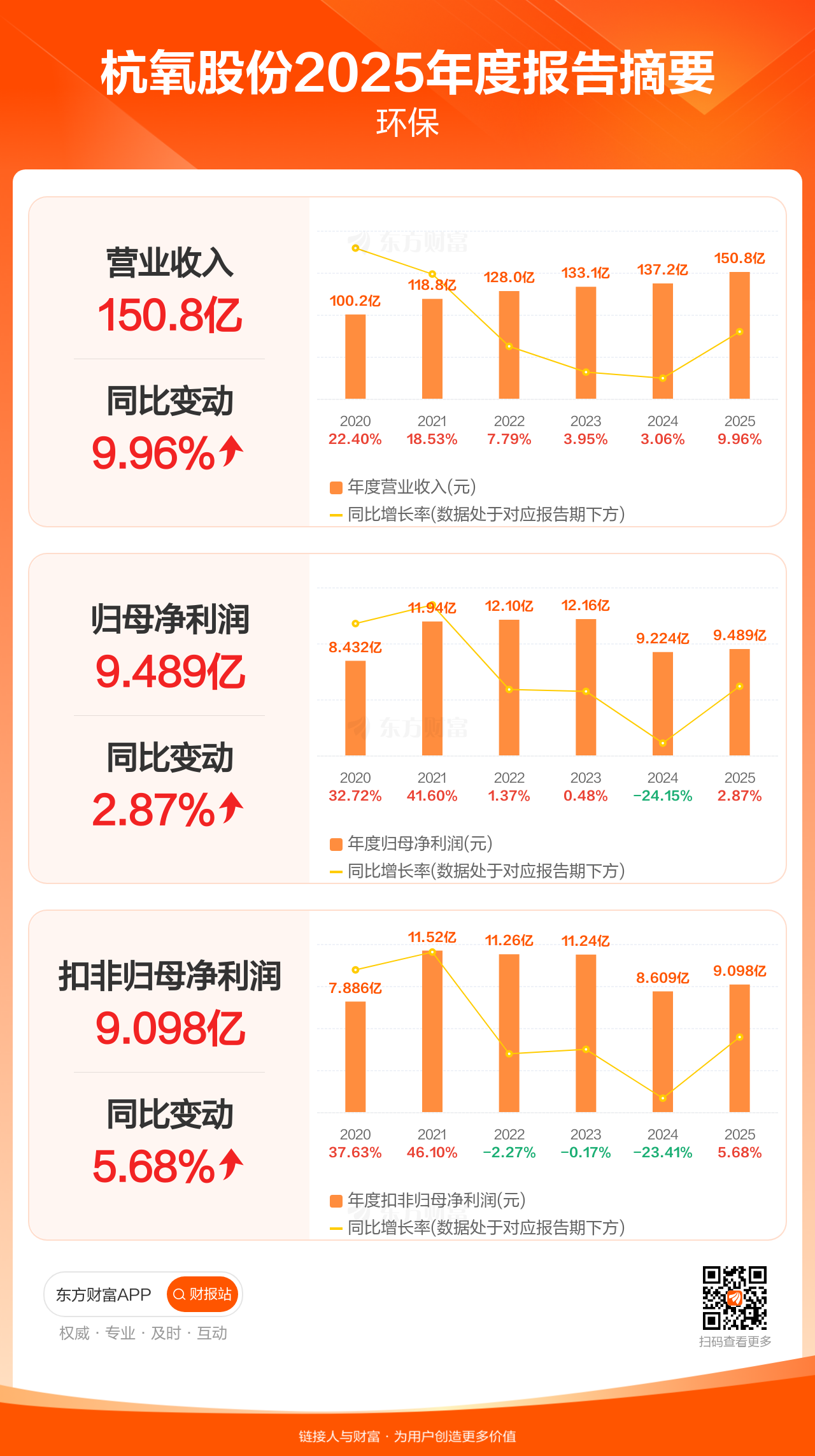 杭氧股份4月11日发布2025年年报显示,公司全年实现营业收入150.83亿元,同比增长9.96%;归母净利润9.49亿元,同比增长2.87%;扣非归母净利润9.10亿元,同比增长5.68%。