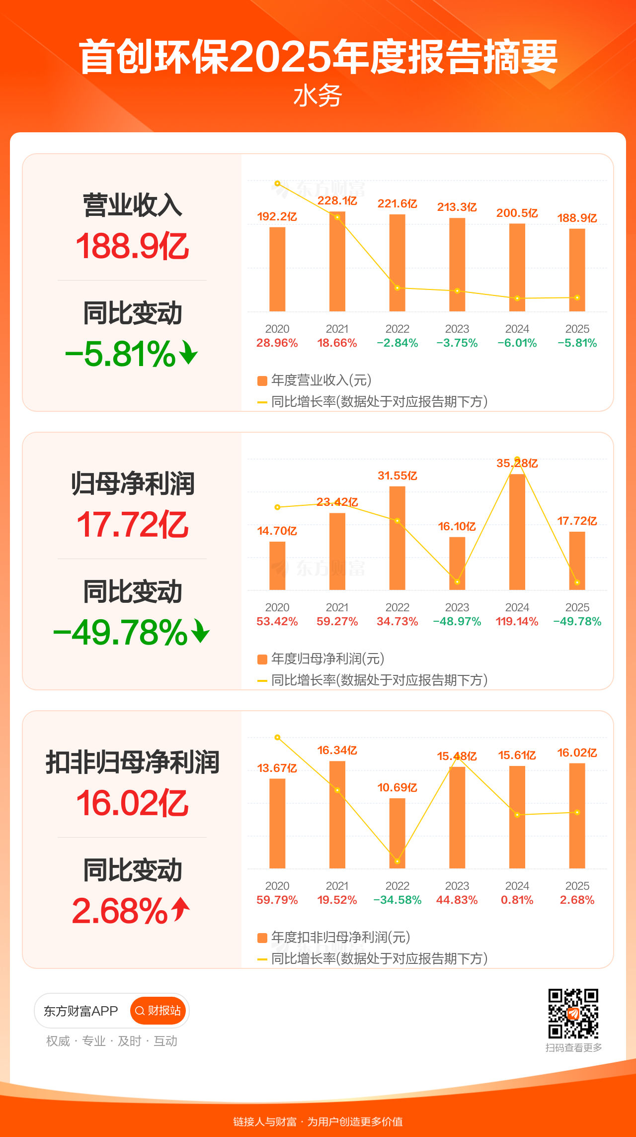 首创环保4月11日发布2025年年报显示,公司全年实现营业收入188.86亿元,同比下滑5.81%;归母净利润17.72亿元,同比下滑49.78%;扣非归母净利润16.02亿元,同比增长2.68%。