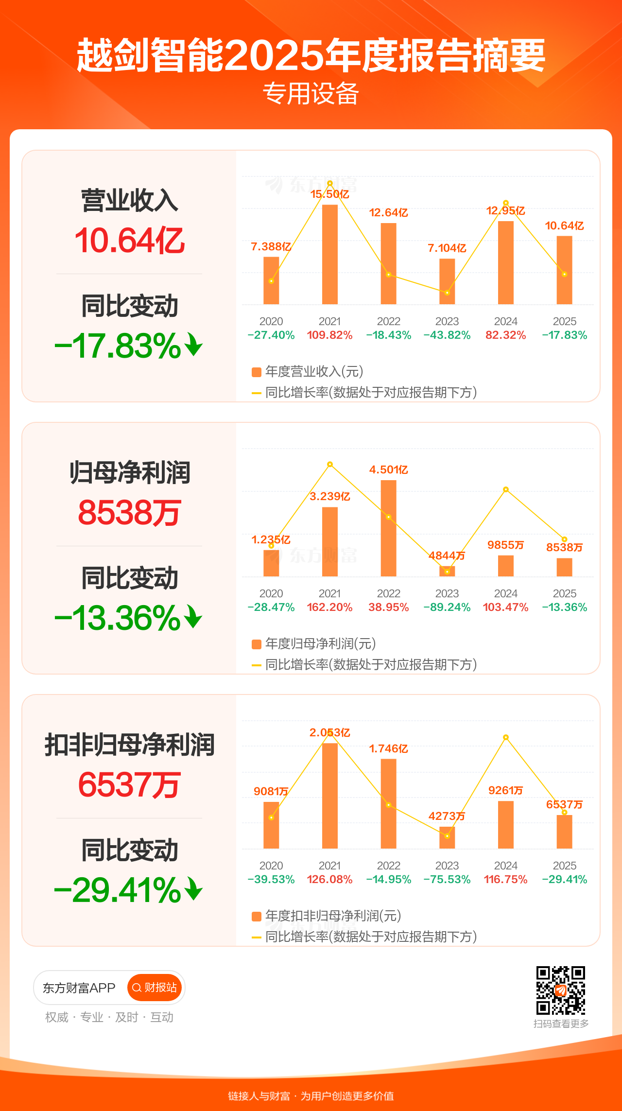 越剑智能4月11日发布2025年年报显示,公司全年实现营业收入10.64亿元,同比下滑17.83%;归母净利润8538.17万元,同比下滑13.36%;扣非归母净利润6536.97万元,同比下滑29.41%。