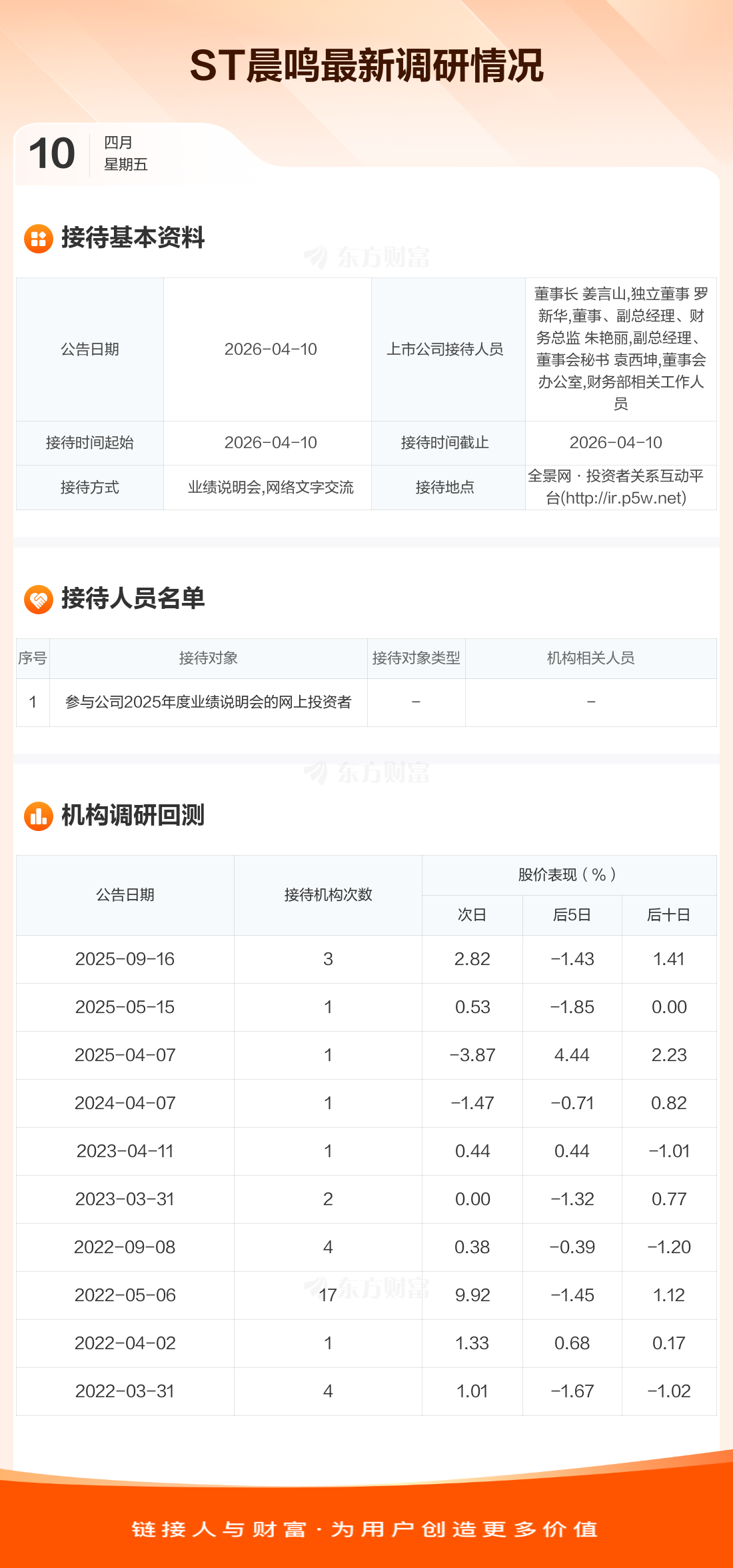 ST晨鸣4月10日公告称,4月10日接待参与公司2025年度业绩说明会的网上投资者等1家机构调研。接待人员包括董事长 姜言山,独立董事 罗新华,董事、副总经理、财务总监 朱艳丽,副总经理、董事会秘书 袁西坤,董事会办公室,财务部相关工作人员。