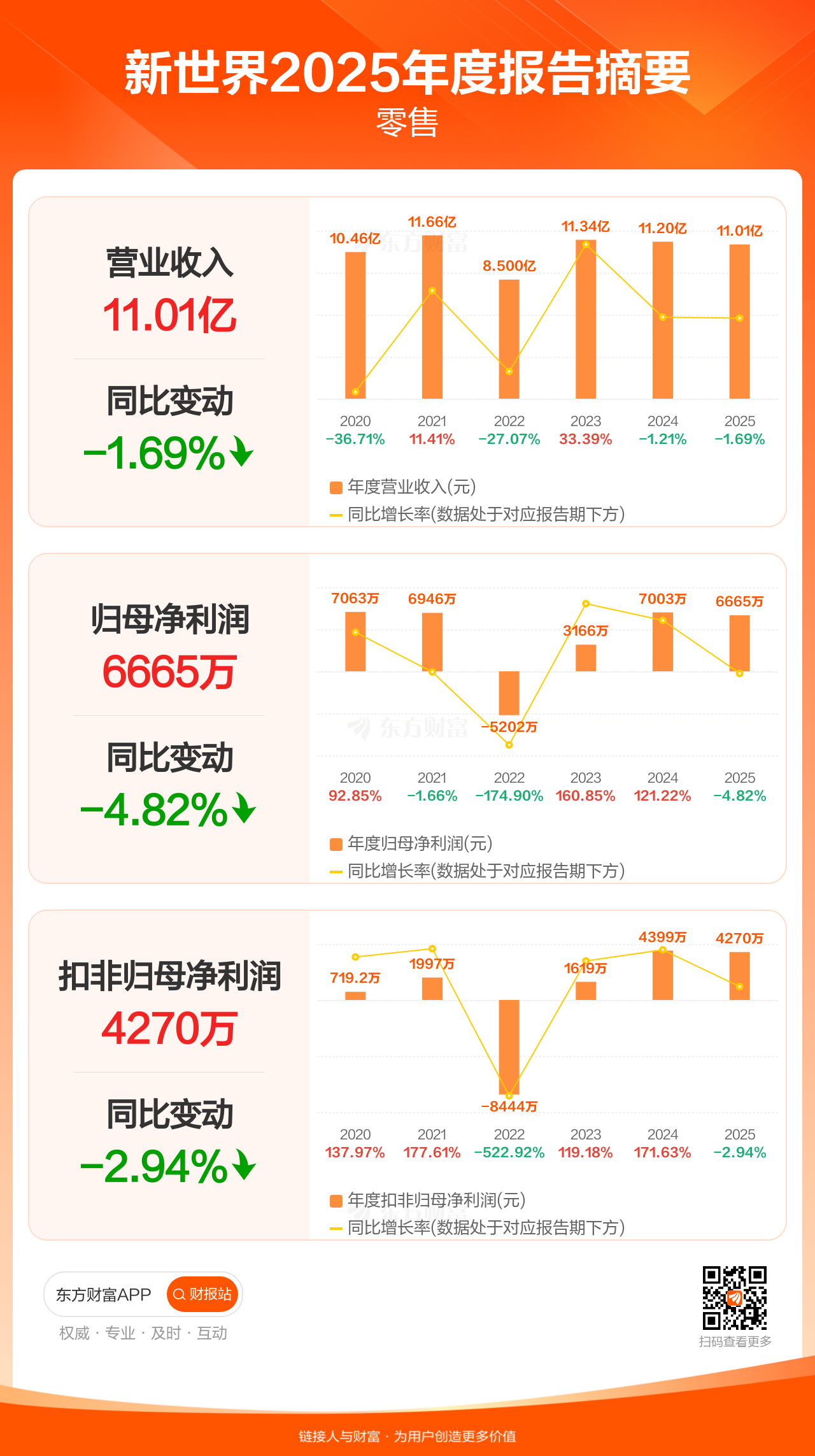 新世界4月11日发布2025年年报显示,公司全年实现营业收入11.01亿元,同比下滑1.69%;归母净利润6665.32万元,同比下滑4.82%;扣非归母净利润4269.83万元,同比下滑2.94%。