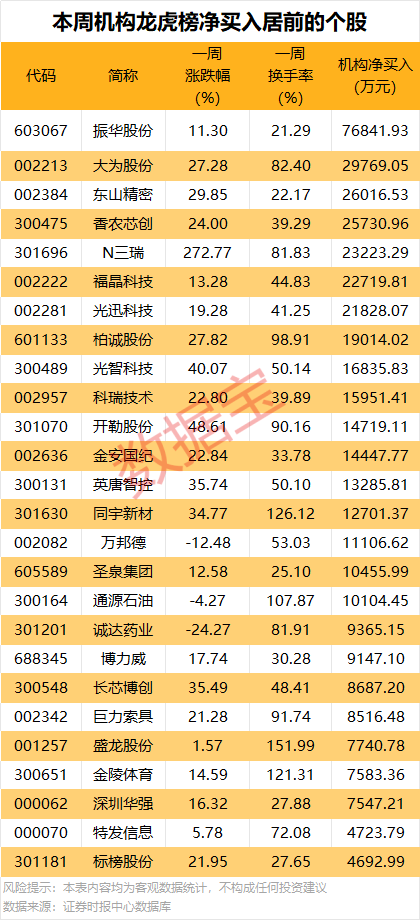 龙虎榜数据显示,本周机构专用席位共现身90股龙虎榜,净买入44股,净卖出46股。其中,机构净买入38股均超千万元,振华股份、大为股份等17股获机构净买入均超1亿元。