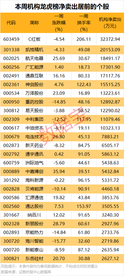 一周机构累计净卖出的个股中,11股金额均超1亿元,其中净卖出金额最多的是C红板,该股本周累计下跌4.54%,周换手率为206.11%,因无价格涨跌幅限制等1次上榜龙虎榜,买卖居前营业部中机构合计净卖出3.24亿元。