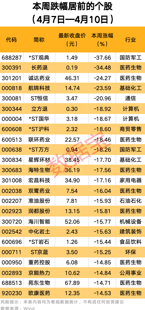 本周累计下跌的个股中,超53股跌幅在10%以上,*ST观典一周累计跌37.66%,居首;长药退、诚达药业、航锦科技等累计跌幅均超20%。