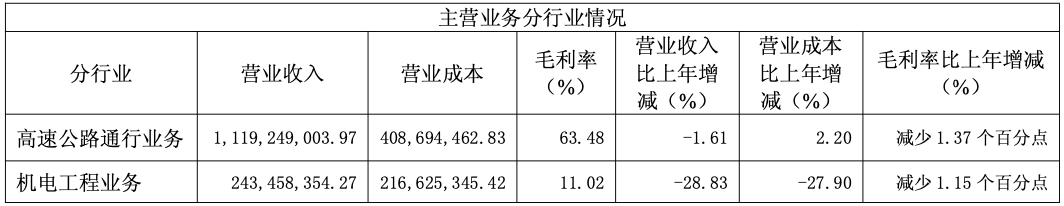 2025年,公司高速公路管理实现营业收入111,925万元,比上年同期下降1.61%;控股子公司吉林省科维交通工程有限公司机电工程收入24,346万元,比上年同期下降28.83%。