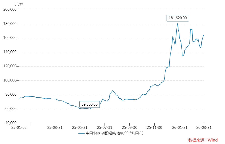 根据Wind统计,今年一季度国内电池级碳酸锂均价达到15.44万元/吨,环比、同比均出现明显上涨,较2025年同期的7.58万元/吨的均价更是涨幅翻倍。