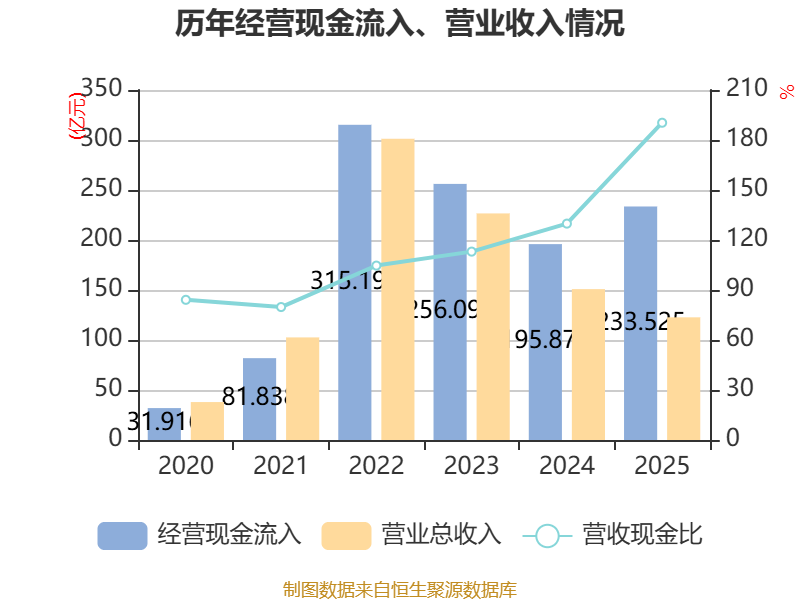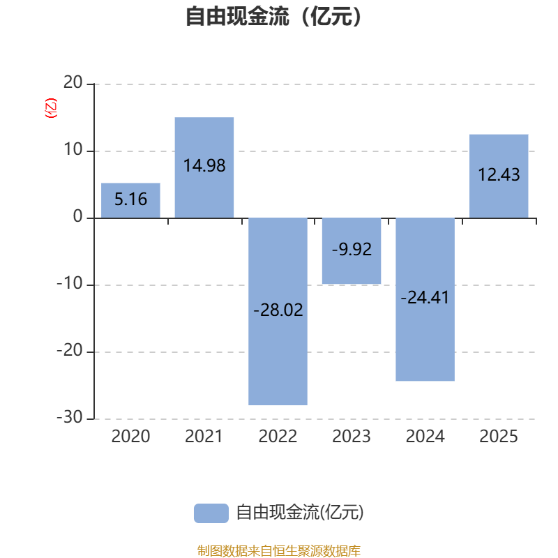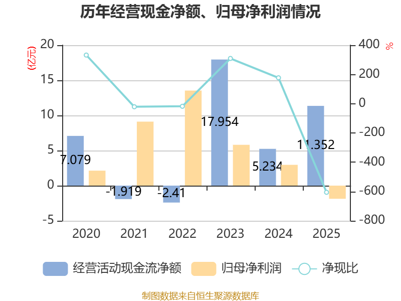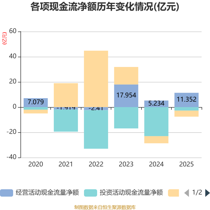 截至2025年,公司经营活动现金流净额为11.35亿元,同比增长116.89%;筹资活动现金流净额-4.8亿元,同比增加8407.76万元;投资活动现金流净额-2.78亿元,上年同期为-23.07亿元。