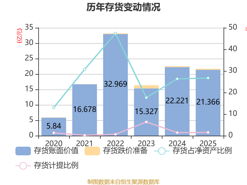 从存货变动来看,截至2025年末,公司存货账面价值为21.37亿元,占净资产的26.73%,较上年末减少8543.06万元。其中,存货跌价准备为3291.69万元,计提比例为1.52%。