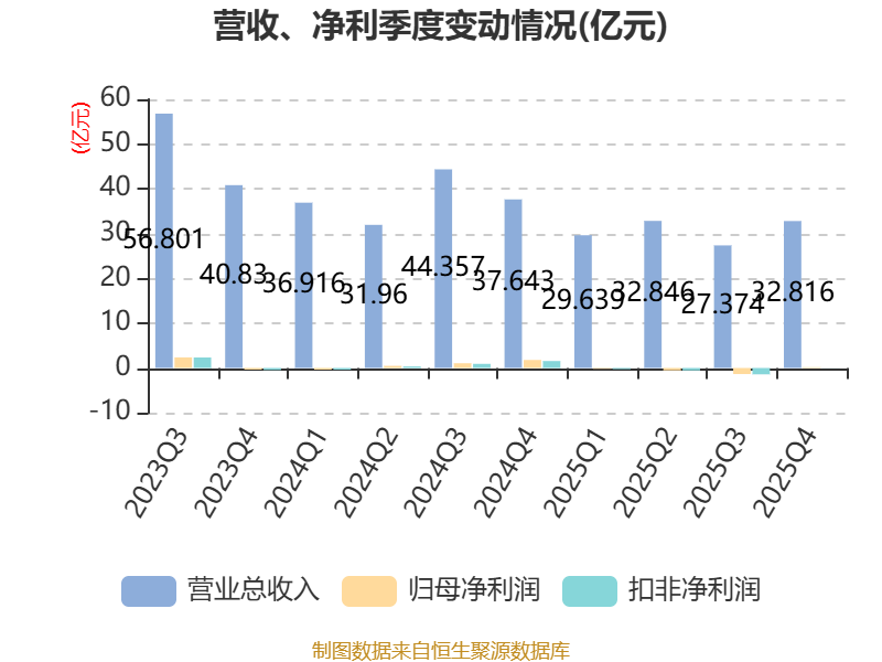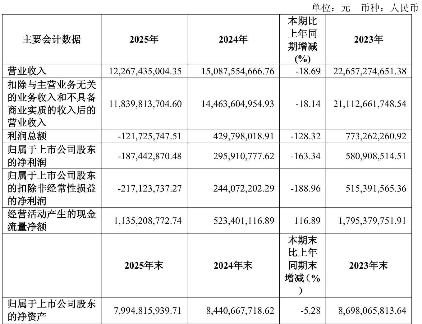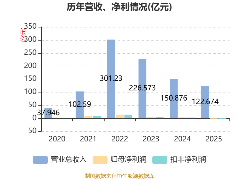 中证智能财讯容百科技(688005)4月11日披露2025年年度报告。2025年,公司实现营业总收入122.67亿元,同比下降18.69%;归母净利润亏损1.87亿元,上年同期盈利2.96亿元;扣非净利润亏损2.17亿元,上年同期盈利2.44亿元;经营活动产生的现金流量净额为11.35亿元,同比增长116.89%;报告期内,容百科技基本每股收益为-0.27元,加权平均净资产收益率为-2.29%。