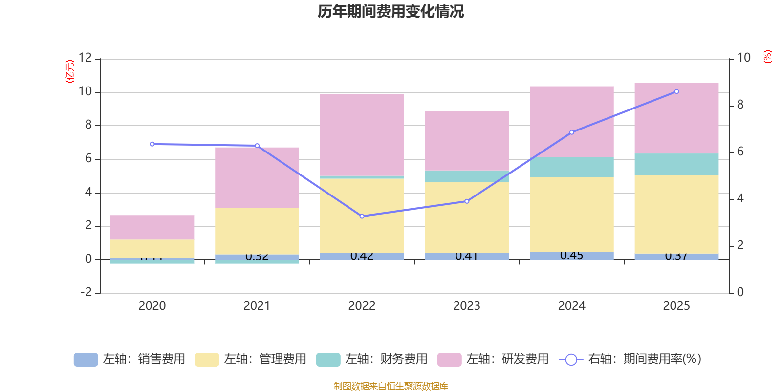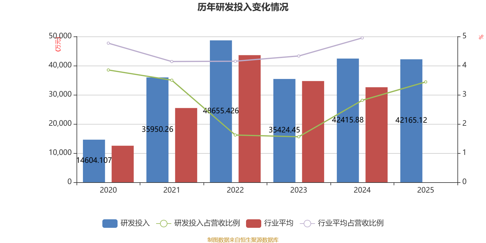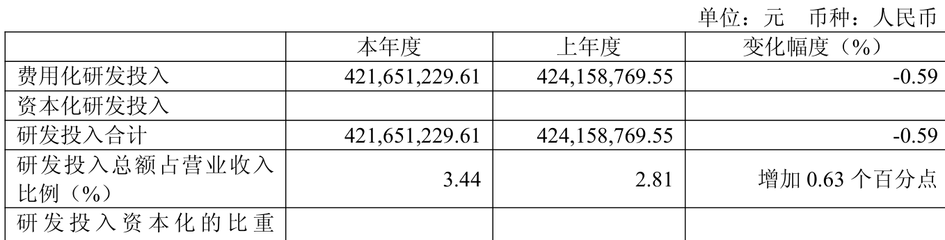 2025年全年,公司研发投入金额为4.22亿元,同比下降0.59%;研发投入占营业收入比例为3.44%,相比上年同期上升0.63个百分点。