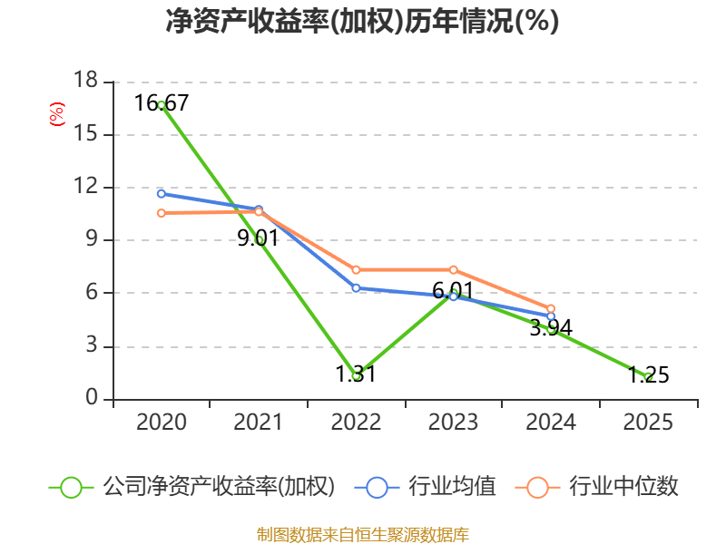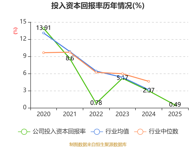 数据显示,2025年公司加权平均净资产收益率为1.25%,较上年同期下降2.69个百分点。公司2025年投入资本回报率为0.49%,较上年同期下降2.48个百分点。