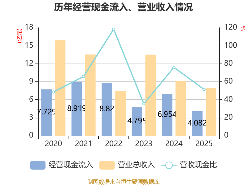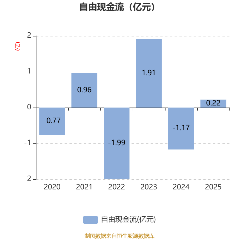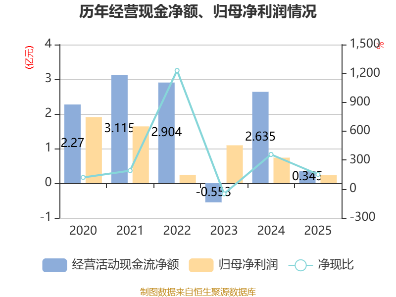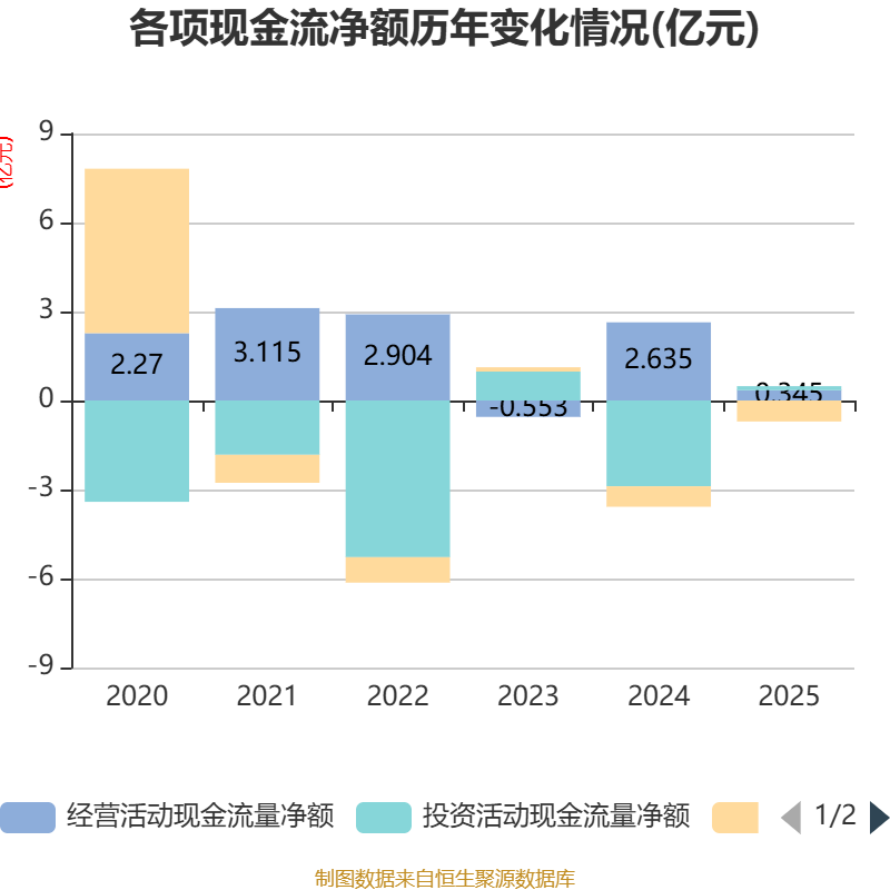 截至2025年,公司经营活动现金流净额为3445.48万元,同比下降86.93%;筹资活动现金流净额-7076.27万元,同比减少167.94万元;投资活动现金流净额1376.21万元,上年同期为-2.89亿元。