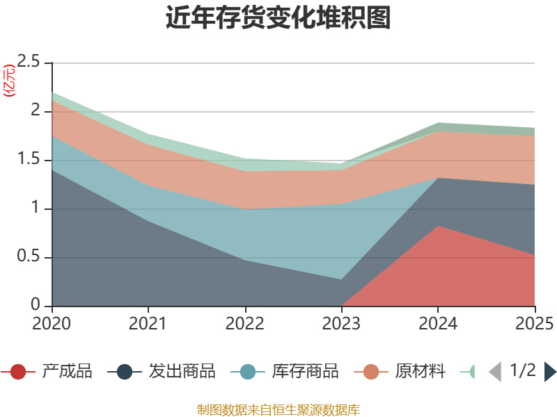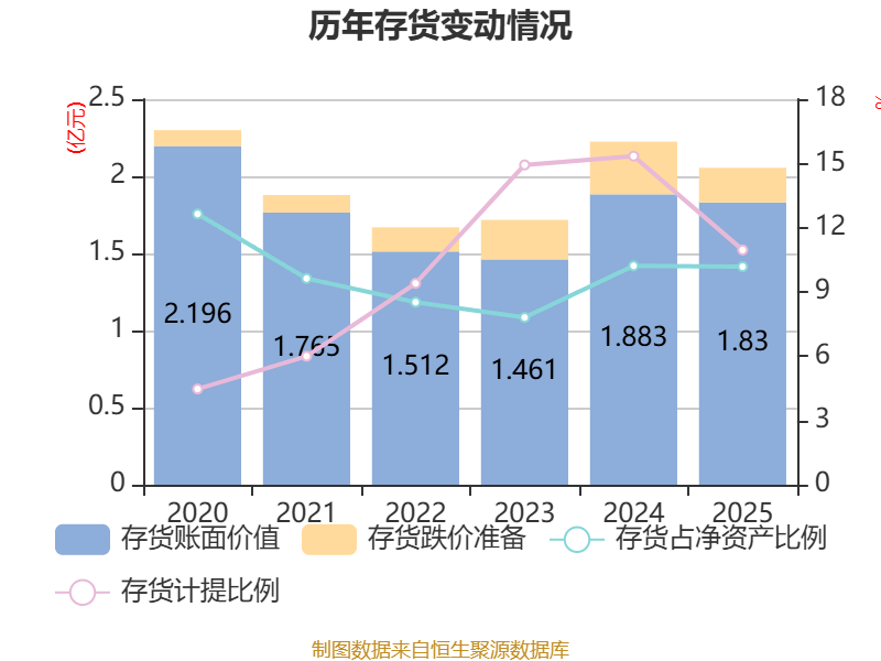 从存货变动来看,截至2025年末,公司存货账面价值为1.83亿元,占净资产的10.18%,较上年末减少530.62万元。其中,存货跌价准备为2251.97万元,计提比例为10.96%。