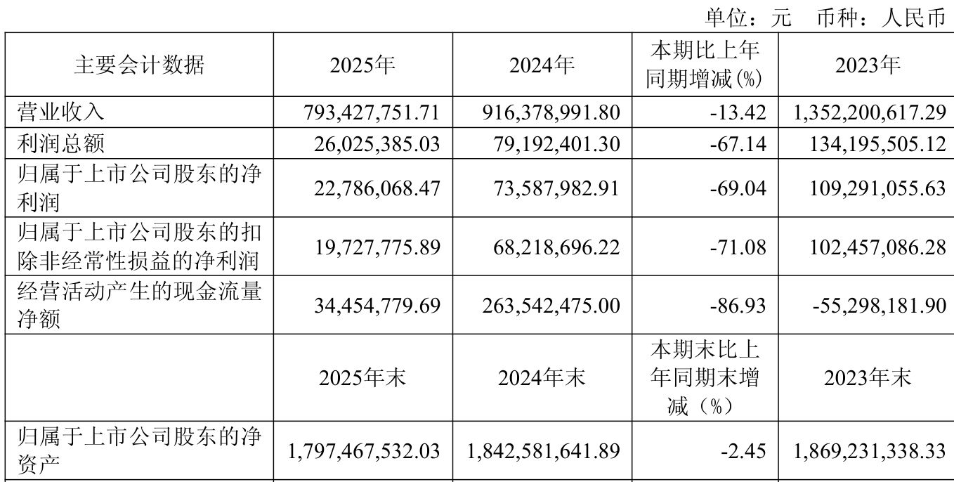 中证智能财讯华丰股份(605100)4月11日披露2025年年度报告。2025年,公司实现营业总收入7.93亿元,同比下降13.42%;归母净利润2278.61万元,同比下降69.04%;扣非净利润1972.78万元,同比下降71.08%;经营活动产生的现金流量净额为3445.48万元,同比下降86.93%;报告期内,华丰股份基本每股收益为0.13元,加权平均净资产收益率为1.25%。公司2025年度分配预案为:拟向全体股东每10股转4股。