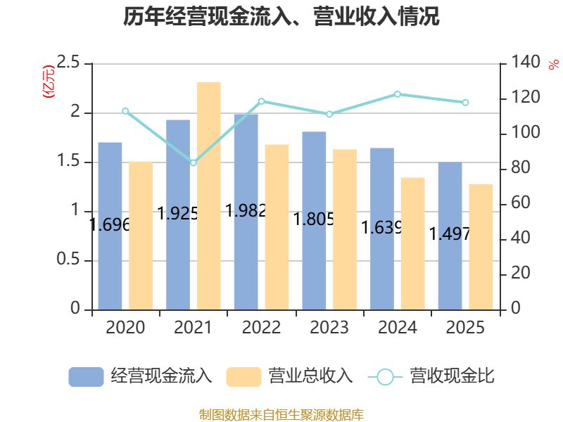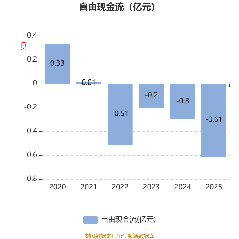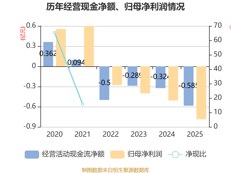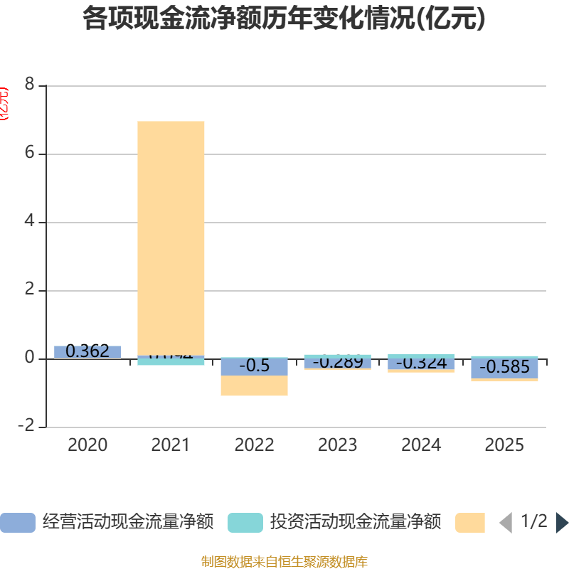截至2025年,公司经营活动现金流净额为-5850.79万元,同比减少2608.59万元;筹资活动现金流净额-828.65万元,同比增加40.17万元;投资活动现金流净额657.9万元,上年同期为1259.07万元。