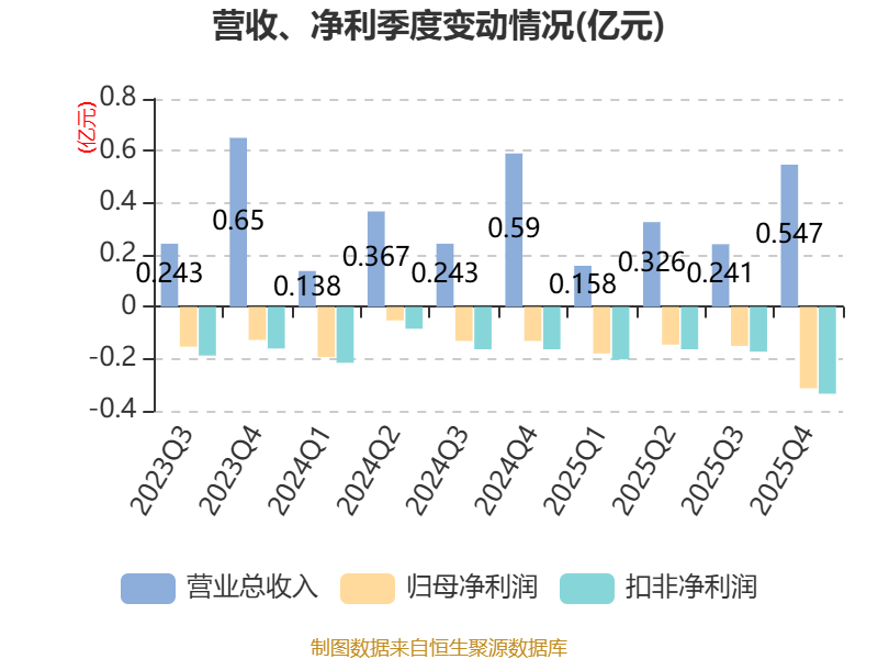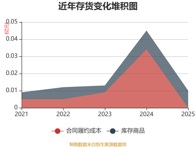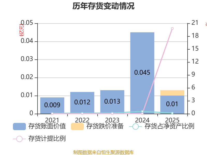 从存货变动来看,截至2025年末,公司存货账面价值为104.78万元,占净资产的0.14%,较上年末减少344.76万元。其中,存货跌价准备为25.85万元,计提比例为19.79%。