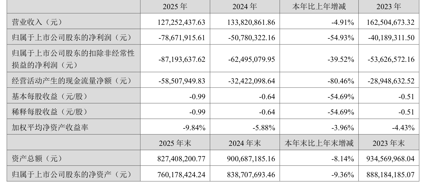 中证智能财讯盈建科(300935)4月11日披露2025年年度报告。2025年,公司实现营业总收入1.27亿元,同比下降4.91%;归母净利润亏损7867.19万元,上年同期亏损5078.03万元;扣非净利润亏损8719.36万元,上年同期亏损6249.51万元;经营活动产生的现金流量净额为-5850.79万元,上年同期为-3242.21万元;报告期内,盈建科基本每股收益为-0.99元,加权平均净资产收益率为-9.84%。