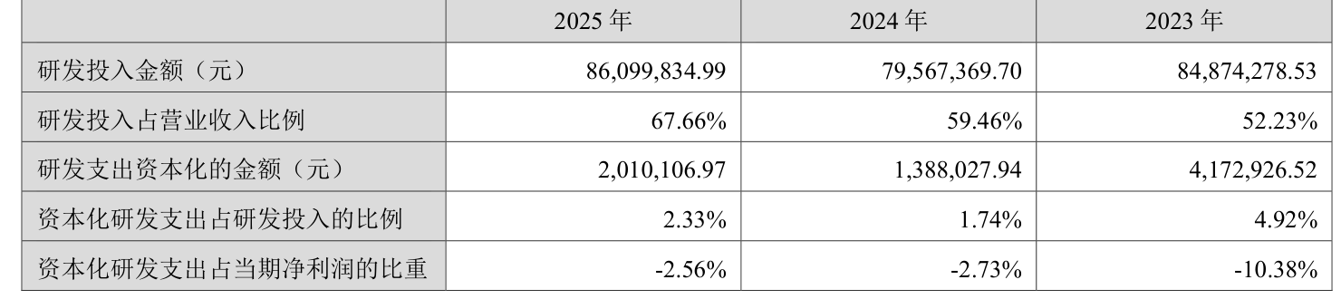 2025年全年,公司研发投入金额为8609.98万元,同比增长8.21%;研发投入占营业收入比例为67.66%,相比上年同期上升8.2个百分点。此外,公司全年研发投入资本化率为2.33%。