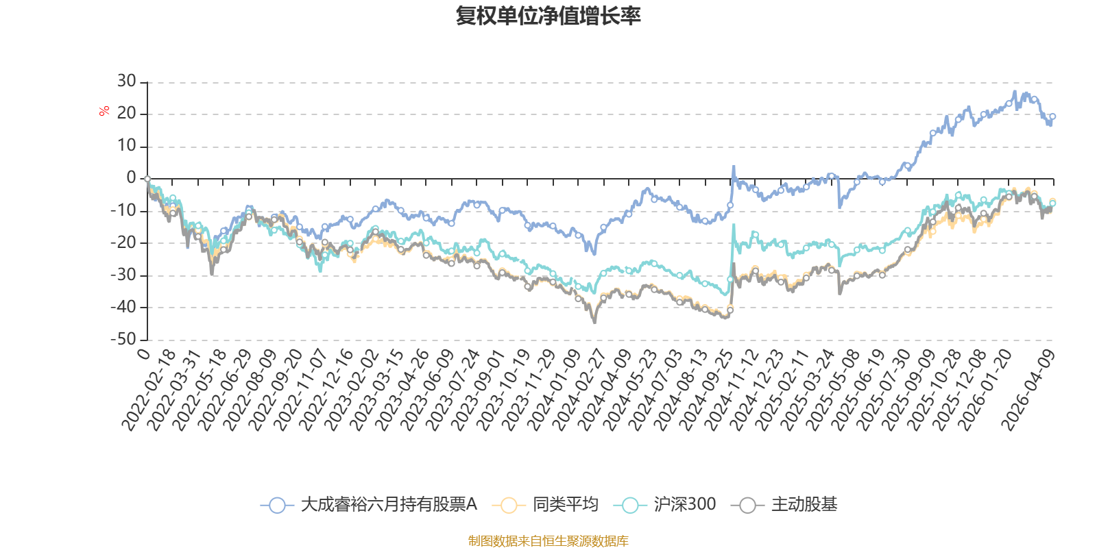 截至4月9日,大成睿裕六月持有股票A近三个月复权单位净值增长率为-2.19%,位于同类可比基金79/121;近半年复权单位净值增长率为-0.26%,位于同类可比基金90/121;近一年复权单位净值增长率为29.80%,位于同类可比基金73/120;近三年复权单位净值增长率为34.39%,位于同类可比基金19/90。