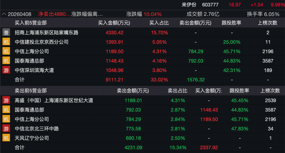 但值得玩味的是,在4月8日晚间来伊份披露公司控股股东及其一致行动人拟以3.84亿元的价格,将10%股权转让给东合恒一(背后实控人为东芯股份董事长蒋学明)前,来伊份的股价就已“率先”涨停,而在4月8日盘后现身龙虎榜的机构和游资,并不仅仅是“抄作业”那般单纯,还充满了“提前抢跑”的算计。