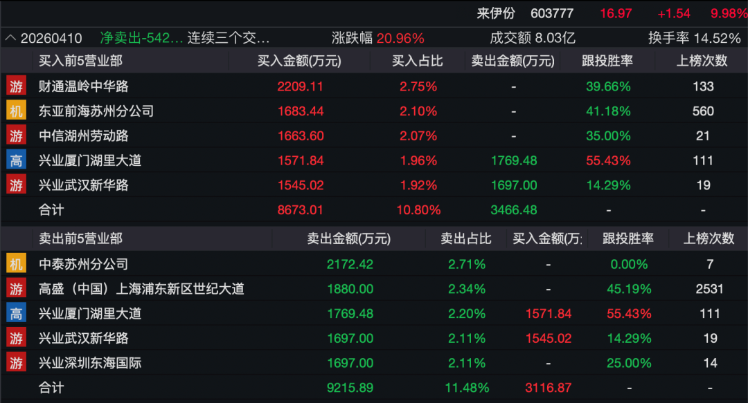 需要注意的是,4月8日龙虎榜以“日涨幅偏离值达7%”的标准披露,反映的是单日资金博弈格局。而4月10日龙虎榜披露的是“连续三个交易日内涨幅偏离值累计达20%”的三日累计数据,反映的是3连板期间的整体资金进出情况。