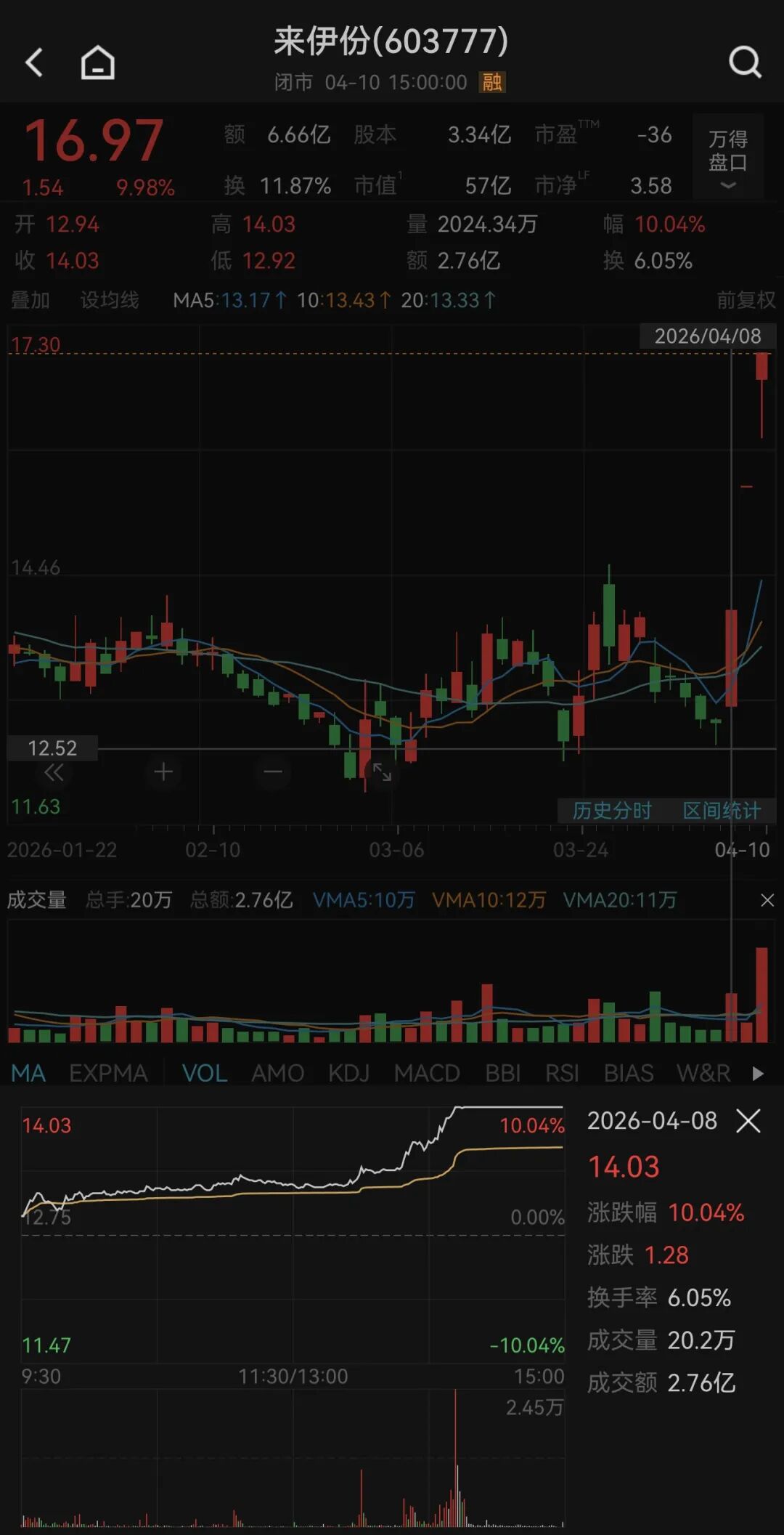 受公告影响,市场情绪持续发酵。4月9日,来伊份“一”字涨停;4月10日再度涨停。4月10日,公司最新市值达到56.75亿元。