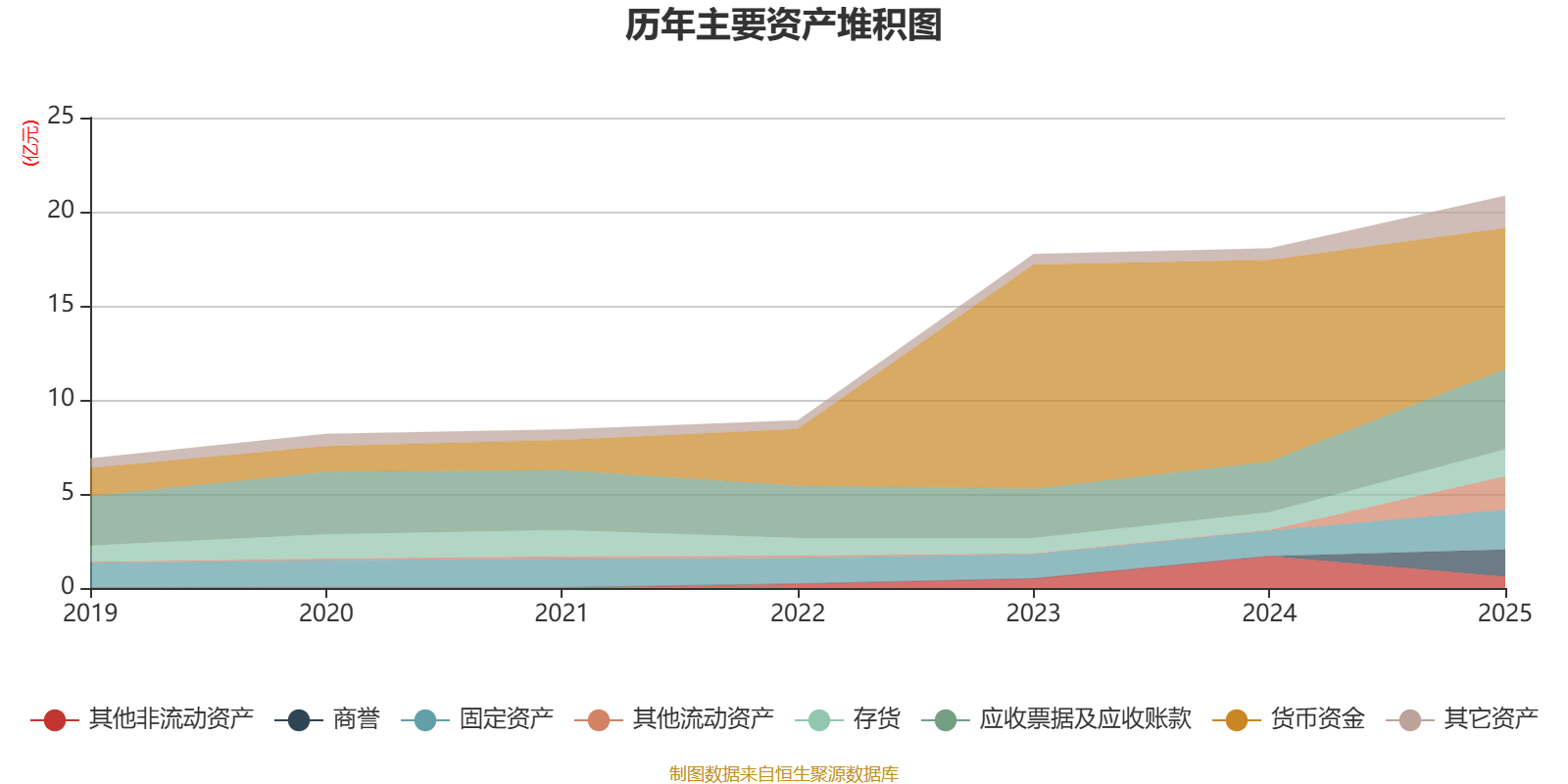 资产重大变化方面,截至2025年末,公司货币资金较上年末减少30.13%,占公司总资产比重下降23.48个百分点;其他流动资产较上年末增加4459.12%,占公司总资产比重上升8.38个百分点;商誉占公司总资产的6.9%,上年末为0;其他非流动资产较上年末减少64.31%,占公司总资产比重下降6.49个百分点。