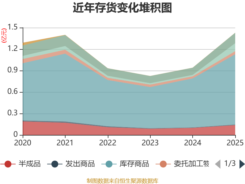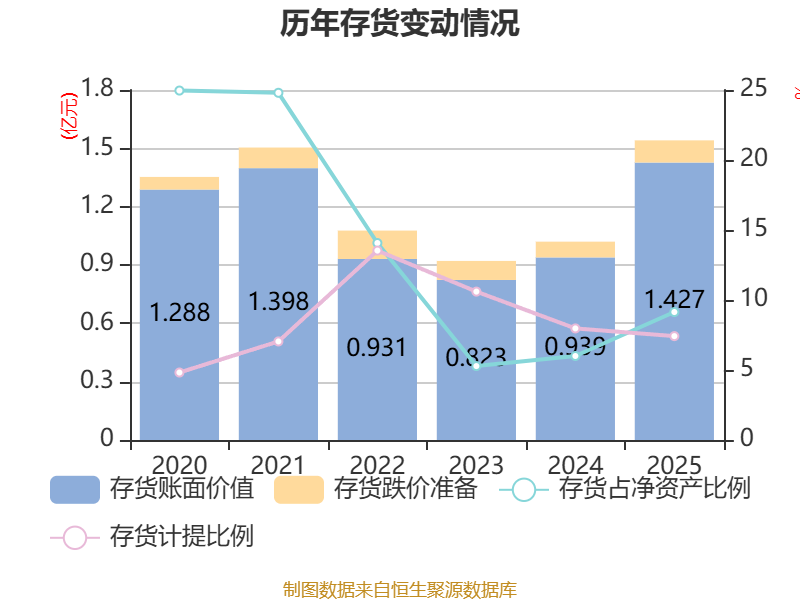 从存货变动来看,截至2025年末,公司存货账面价值为1.43亿元,占净资产的9.14%,较上年末增加4888.48万元。其中,存货跌价准备为1143.31万元,计提比例为7.42%。