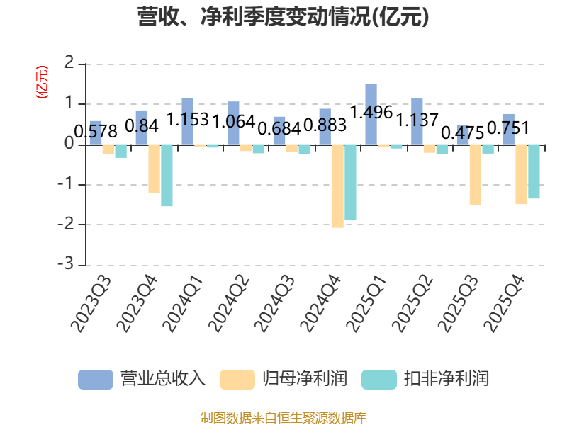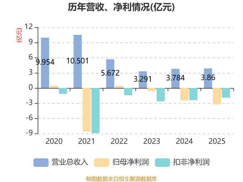 中证智能财讯勤上股份(002638)4月11日披露2025年年度报告。2025年,公司实现营业总收入3.86亿元,同比增长2.01%;归母净利润亏损3.27亿元,上年同期亏损2.49亿元;扣非净利润亏损1.94亿元,上年同期亏损2.42亿元;经营活动产生的现金流量净额为-2597.06万元,上年同期为-5625.7万元;报告期内,勤上股份基本每股收益为-0.23元,加权平均净资产收益率为-15.77%。