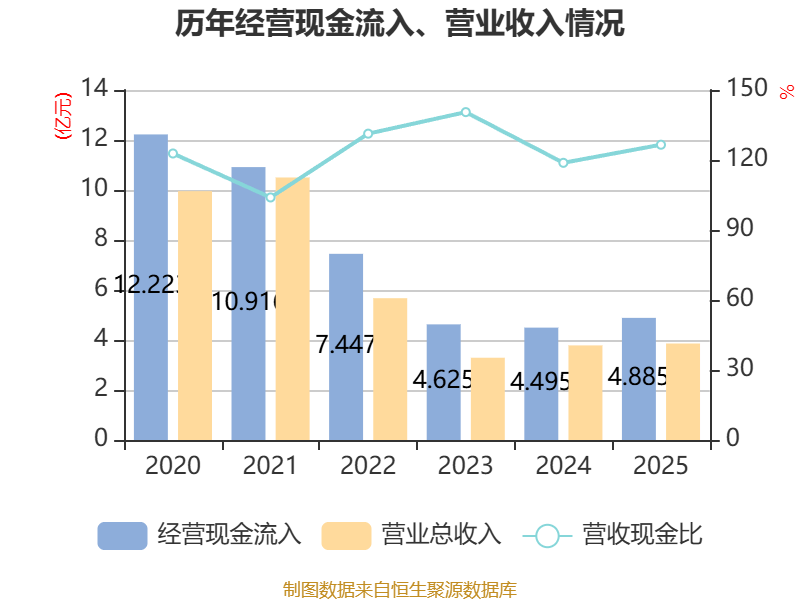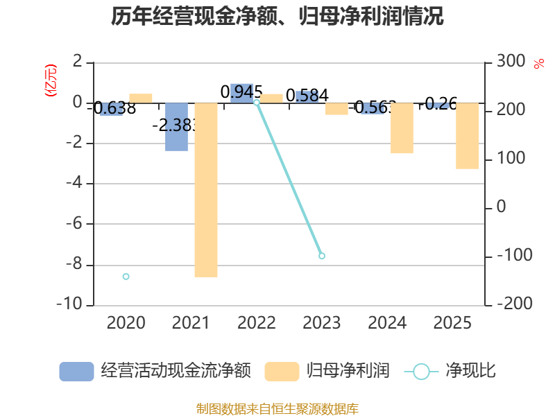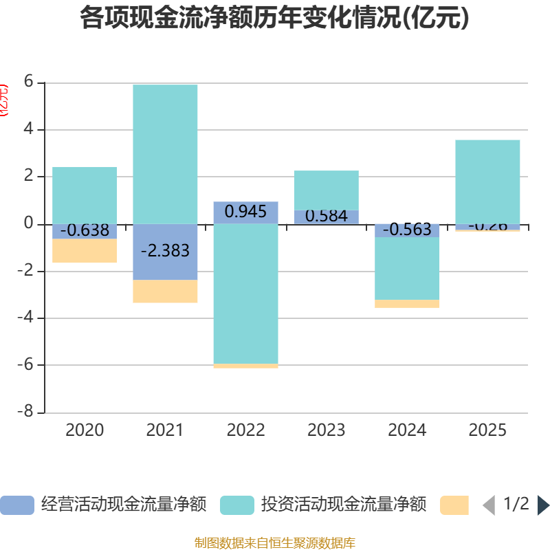 截至2025年,公司经营活动现金流净额为-2597.06万元,同比增加3028.64万元;筹资活动现金流净额-625.91万元,同比增加2778.18万元;投资活动现金流净额3.56亿元,上年同期为-2.66亿元。