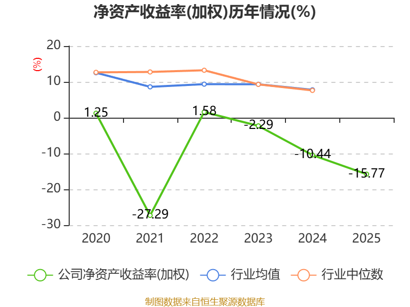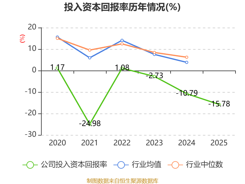 数据显示,2025年公司加权平均净资产收益率为-15.77%,较上年同期下降5.33个百分点。公司2025年投入资本回报率为-15.78%,较上年同期下降4.99个百分点。