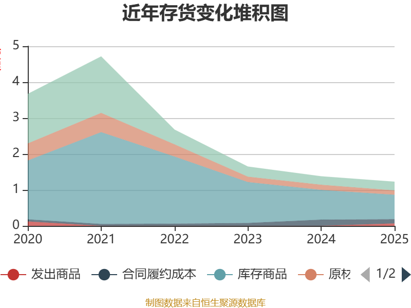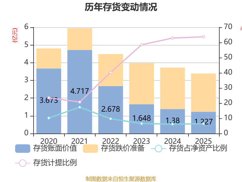 从存货变动来看,截至2025年末,公司存货账面价值为1.23亿元,占净资产的6.41%,较上年末减少1533.31万元。其中,存货跌价准备为2.16亿元,计提比例为63.77%。
