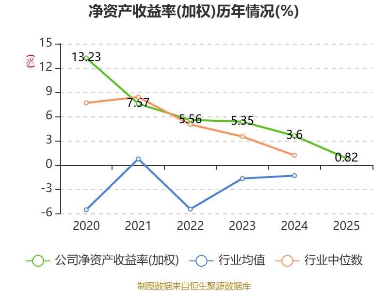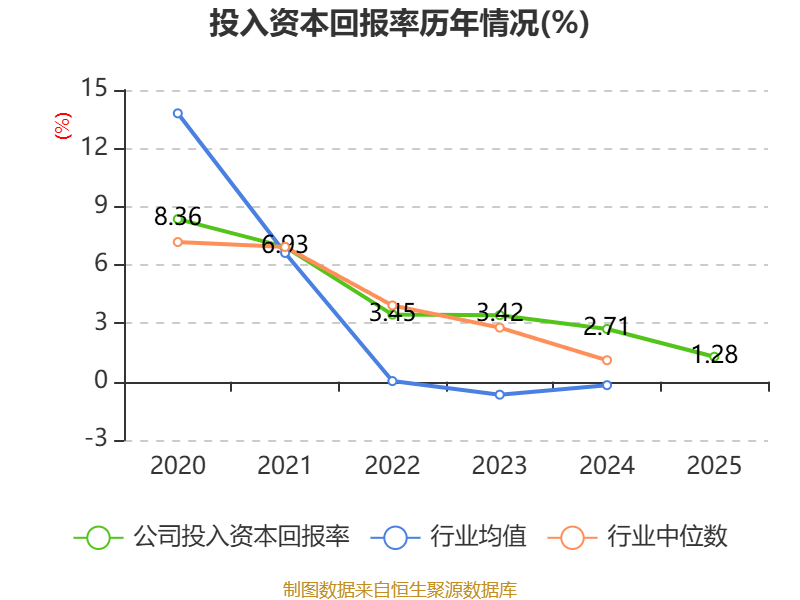 数据显示,2025年公司加权平均净资产收益率为0.82%,较上年同期下降2.78个百分点。公司2025年投入资本回报率为1.28%,较上年同期下降1.43个百分点。