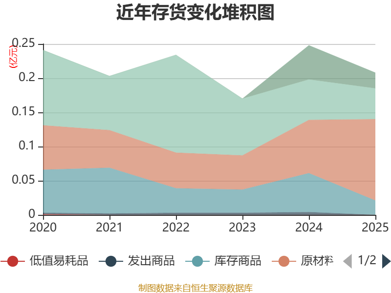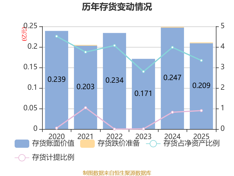 从存货变动来看,截至2025年末,公司存货账面价值为2091.72万元,占净资产的3.34%,较上年末减少381.43万元。其中,存货跌价准备为19.03万元,计提比例为0.9%。