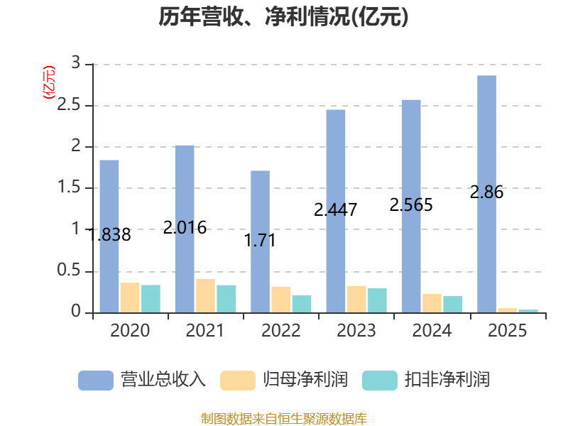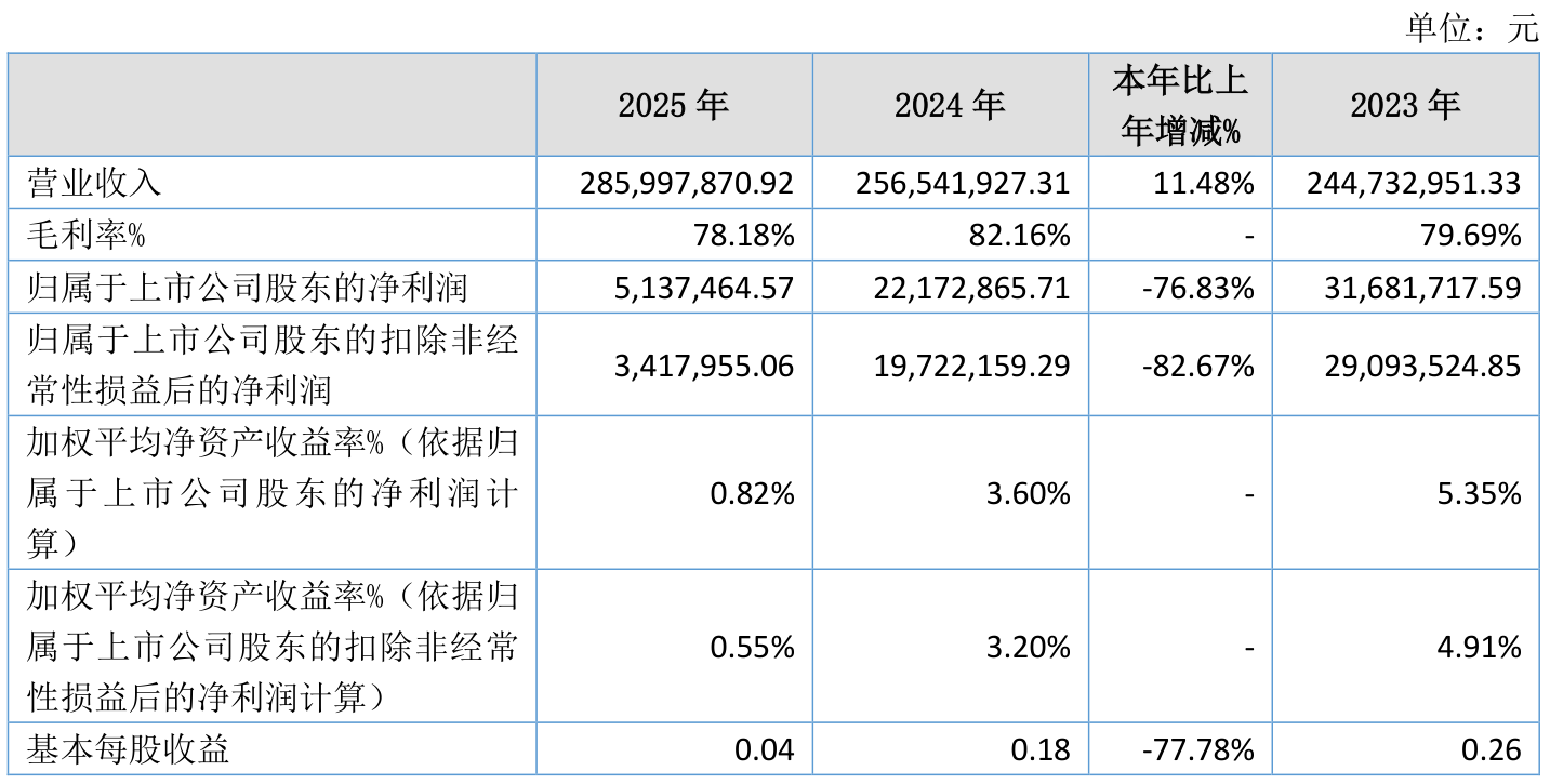 中证智能财讯三元基因(920344)4月10日披露2025年年度报告。2025年,公司实现营业总收入2.86亿元,同比增长11.48%;归母净利润513.75万元,同比下降76.83%;扣非净利润341.8万元,同比下降82.67%;经营活动产生的现金流量净额为6565.53万元,同比下降5.93%;报告期内,三元基因基本每股收益为0.04元,加权平均净资产收益率为0.82%。