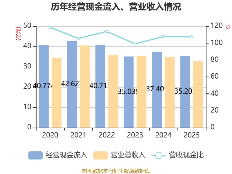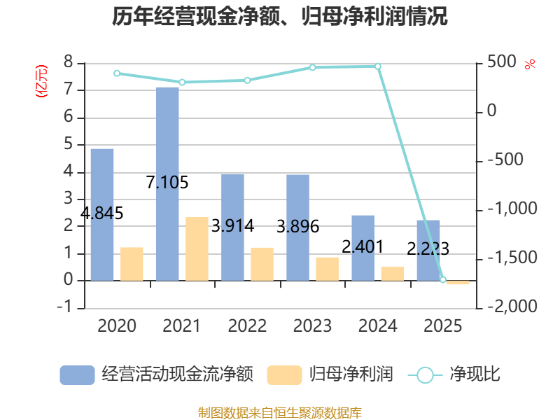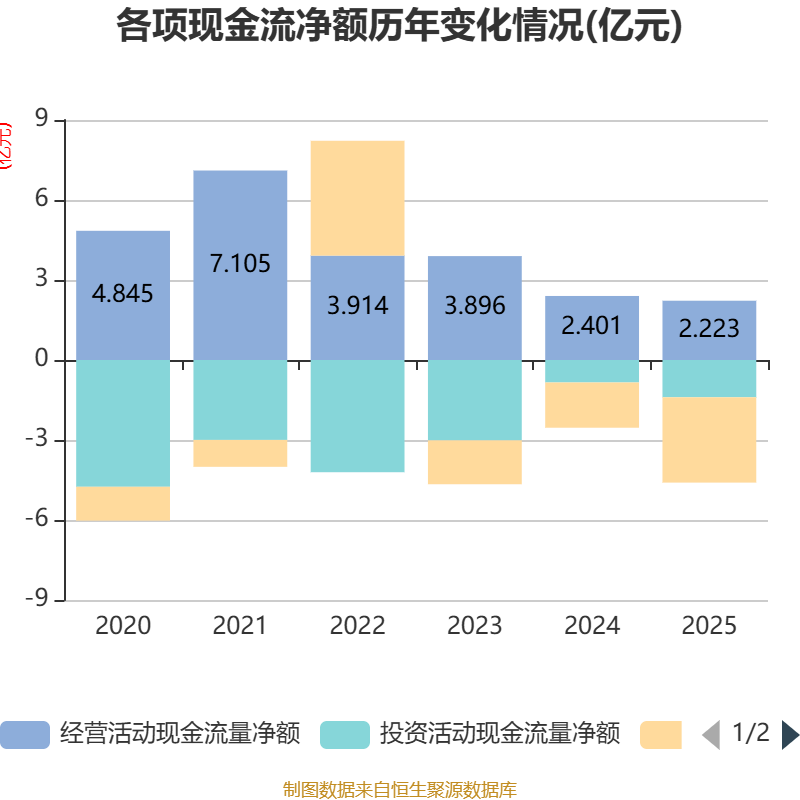 截至2025年,公司经营活动现金流净额为2.22亿元,同比下降7.41%;筹资活动现金流净额-3.2亿元,同比减少1.5亿元;投资活动现金流净额-1.4亿元,上年同期为-8429.27万元。