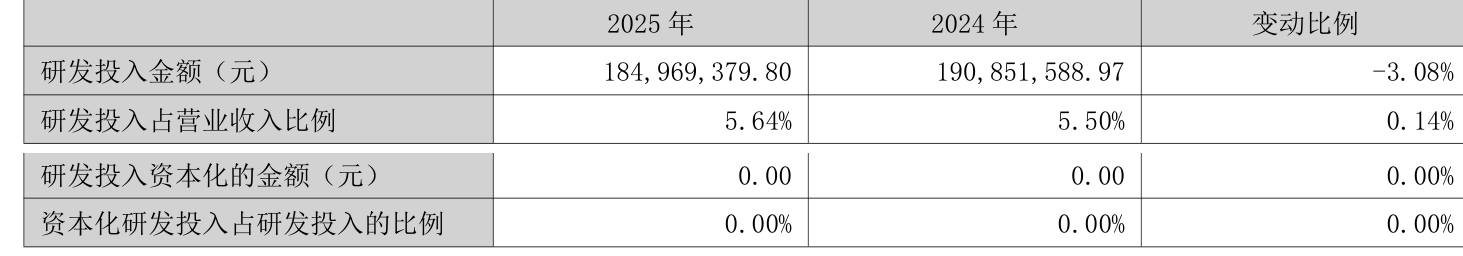 2025年全年,公司研发投入金额为1.85亿元,同比下降3.08%;研发投入占营业收入比例为5.64%,相比上年同期上升0.14个百分点。此外,公司全年研发投入资本化率为0%。
