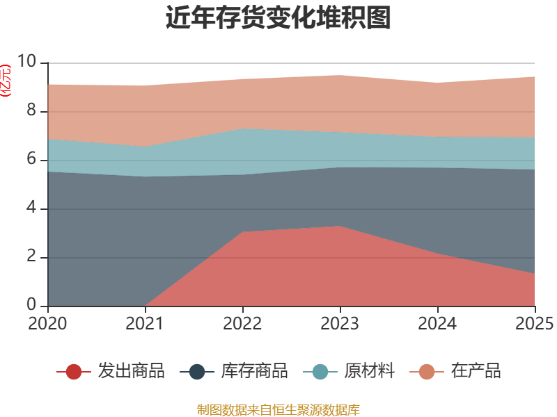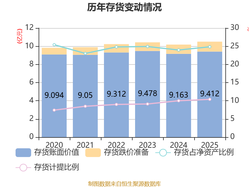 从存货变动来看,截至2025年末,公司存货账面价值为9.41亿元,占净资产的24.84%,较上年末增加2496.99万元。其中,存货跌价准备为1.09亿元,计提比例为10.4%。