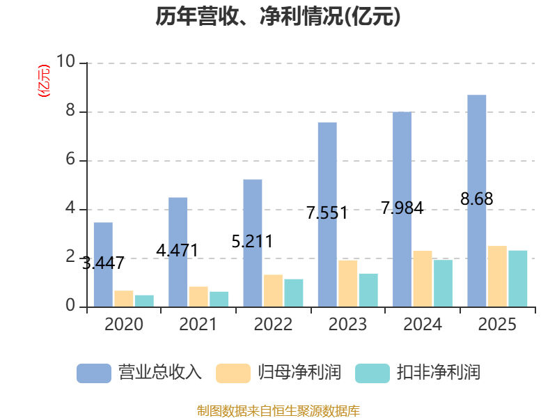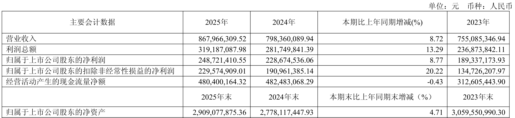 中证智能财讯西高院(688334)4月11日披露2025年年度报告。2025年,公司实现营业总收入8.68亿元,同比增长8.72%;归母净利润2.49亿元,同比增长8.77%;扣非净利润2.3亿元,同比增长20.22%;经营活动产生的现金流量净额为4.8亿元,同比下降0.43%;报告期内,西高院基本每股收益为0.7857元,加权平均净资产收益率为8.69%。公司2025年度分配预案为:拟向全体股东每10股派现2.05元(含税)。