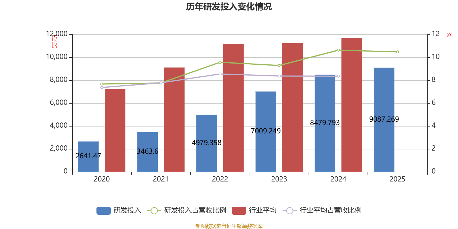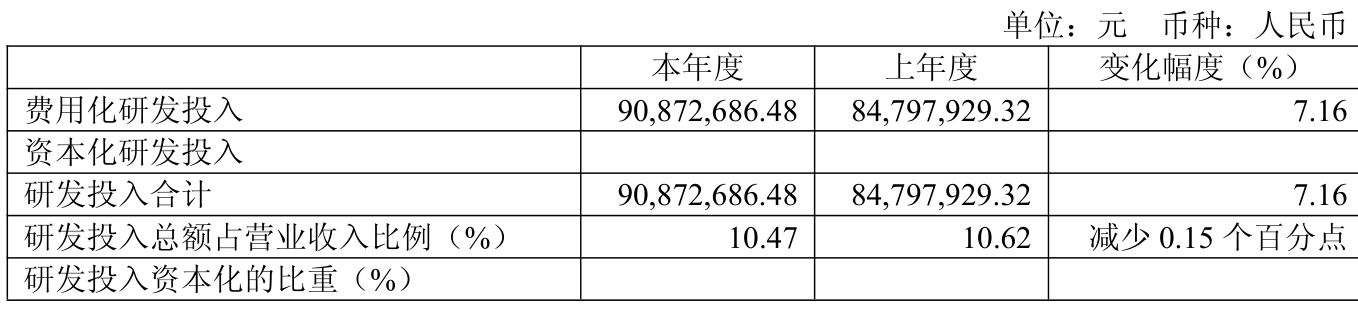 2025年全年,公司研发投入金额为9087.27万元,同比增长7.16%;研发投入占营业收入比例为10.47%,相比上年同期下降0.15个百分点。
