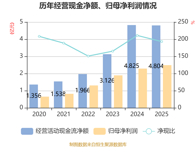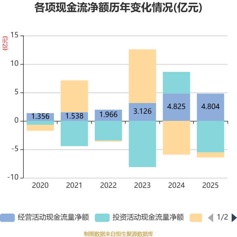 截至2025年,公司经营活动现金流净额为4.8亿元,同比下降0.43%;筹资活动现金流净额-8996.87万元,同比增加5.03亿元;投资活动现金流净额-5.53亿元,上年同期为3.79亿元。