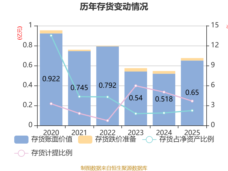 从存货变动来看,截至2025年末,公司存货账面价值为6499.06万元,占净资产的2.23%,较上年末增加1314.33万元。其中,存货跌价准备为247.08万元,计提比例为3.66%。